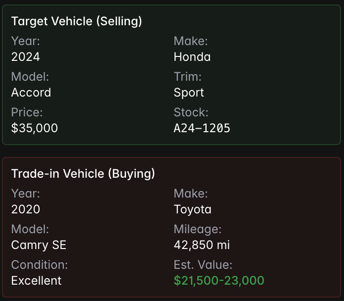 AI specifically trained on dealership conversations including trade-ins, financing, and vehicle features.
